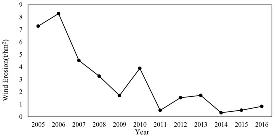 From 2005 to 2016, the annual average wind erosion clearly decreased in HLBB (Figure 4). The Mann–Kendall test indicated a significant downward trend and a turning point in 2009. The decreasing trend of wind erosion was quite strong before 2009, but slowed down after 2009. The maximum and minimum annual average wind erosion reached 8.29 and 0.33 t/hm2·a in 2006 and 2014, respectively.