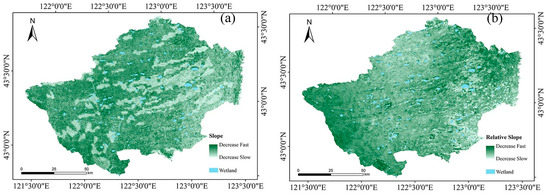 The spatial distribution of wind erosion change trends in HLBB from 2005 to 2016. (a) the slope of wind erosion (θ), (b) the relative slope of wind erosion (γ).