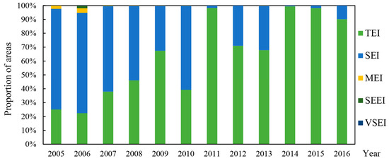 The proportion of different wind erosion intensity areas from 2005 to 2016 in HLBB. Note: TEI: tolerable erosion intensity; SEI: slight erosion intensity; MEI: moderate erosion intensity; SEEI: severe erosion intensity; VSEI: very severe erosion intensity.