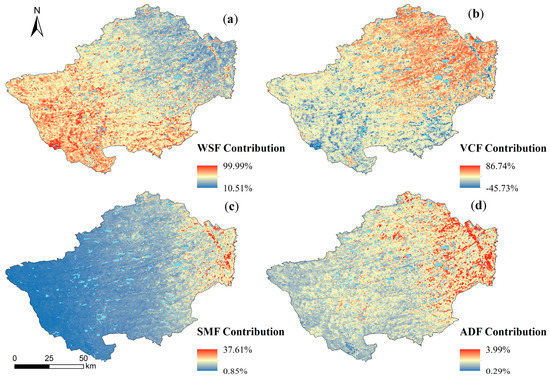 The results showed that the decrease in WSF and the increase in VCF played key roles in wind erosion reduction. The contributions from the other two factors were relatively small. Firstly, the average contribution of WSF in HLBB was 47.40%, which decreased from west to east. This spatial pattern was similar to the trend of wind erosion. Secondly, the average contribution of VCF was 45.93%. The spatial distribution exhibited a strong correlation with vegetation coverage. Thirdly, the average contribution of SMF was about 5.43%. The high contribution was mainly distributed in the eastern part of HLBB. Finally, the average contribution of ADF was 0.96%, which increased from west to east (Figure 7).