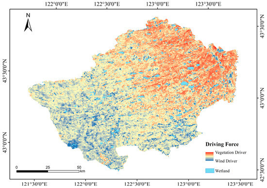 Since the 1980s, the local government has implemented a series of policies and measures to control desertification, such as the “Two Million Mu” Sand Control Demonstration Project, the “Converting Farmland to Forest Project”, and the “Three Norths Shelter Forest System Project (Phase V)”. The construction of these projects is expected to control land desertification and slow down wind erosion by planting trees and grasses in areas under severe desertification in the northwest and north HLBB. The trend of desertification has started to reverse in recent years [32]. However, some remote and broad sandy areas that are relatively difficult to treat are not controlled yet. Identifying the driving factors of wind erosion is the key to overcoming the obstacles of wind erosion control in HLBB.