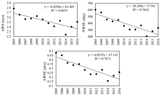Wind speed is widely regarded as the driving force of wind erosion [21]. Our results of the contribution analysis also confirmed that the decline of WSF was one of the main contributing factors to the declining trend of wind erosion in HLBB. The change in WSF exhibited critical impacts on the wind erosion modulus. Thus, it is necessary to explore the relationship between wind-related characteristics and wind erosion. We selected three indicators to analyze, namely the average wind speed (AWS), the number of days when the wind speed exceeded the threshold of the sand detachment wind speed (NWSE), and the average wind speed exceeding the threshold of sand detachment wind speed (AWSE). At the annual scale, all the indicators exhibited clear downward trends from 2005 to 2016 (Figure 9). The annual AWS decreased 9.89% from 2006 to 2015, and the annual NWSE decreased 45.20%. At the same time, the annual AWSE dropped by 46.35%, which was the largest decline among the three.