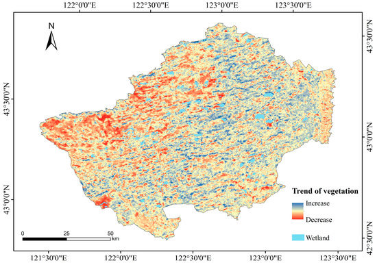 The non-parametric Mann–Kendall test proposed by Mann [43] and improved by Kendall [44] is widely used when the probability distribution of data is undefined [45]. Since the distribution of wind erosion in a time series also does not follow a particular probability distribution, the Mann–Kendall test is used for trend and catastrophe analyses of wind erosion in this study. However, the Mann–Kendall test focuses on the temporal analysis rather than spatial distribution. Both wind erosion and its changes exhibit significant spatial heterogeneity. Thus, the linear regression analysis is used in each grid to detect the spatial characteristics of wind erosion change trends. The regression coefficient represented the trend slope, which is calculated as follows: