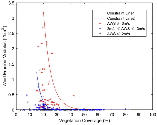 The relationships between the wind erosion modulus and vegetation coverage under different semi-monthly average wind speed (AWS). Note: Constraint lines 1 and 2 are the relationship between the wind erosion modulus and the semi-monthly AWS above 3 m/s and between 2 and 3 m/s, respectively.