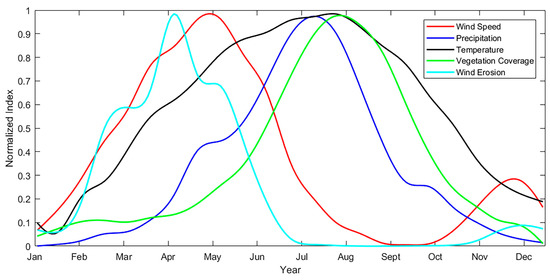 The semi-monthly temporal characteristics of wind erosion and four natural factors. Note: all factors are normalized by the maximum and minimum values.