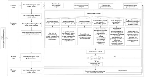 With the implementation of policies such as “The Belt and Road”, the number of cross-border projects has increased, which provides a broader space for the practice of project management. Modern project management not only requires the support of all kinds of ‘hardware’ but the assistance of ‘software’ such as project management culture. Therefore, the development process of SPC should be included, in addition to building SPC. At present, there are few studies about the evolutionary path of SPC, but many researchers have studied similar corporate culture. By analyzing the existing literature shown in Appendix B, it can be found that the development of culture generally includes four stages: generation, interpretation, identification, and following [67,68,69,70,71,72,73]. As a management culture, SPC includes some other complex processes, such as creation, formation, improvement, and heritability. Therefore, the evolutionary path of SPC can be constructed in four steps: cultural creation, cultural formative, cultural maturity, and cultural heritage, as shown in Figure 2.