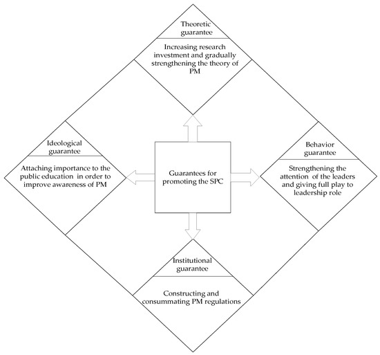 The evolutionary process of culture can be influenced by the social environment. At present, some problems in the social environment obstruct SPC evolution, such as lack of awareness of PM [74], insufficient attention of leaders paid to PM [75], and inadequate systems built for PM [76]. Solving these problems is a prerequisite for building the SPC, but it is a complex process involving many disciplines, such as organizational ecology [77,78], management [7,9,14], and organizational management [79]. Therefore, considering the existing literature in different disciplines, this paper proposes four supporting guarantees (i.e., theoretic guarantee, behavior guarantee, institutional guarantee, and ideological guarantee) in order to solve the problems for confirming the realization of SPC (Figure 3), which are elucidated as follows.