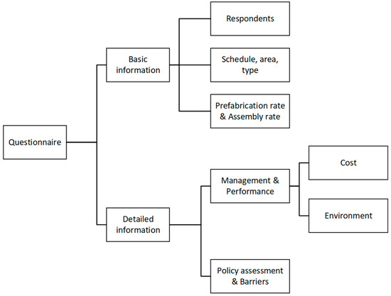 The questionnaire design followed the principles of quantitative and qualitative research. The questionnaire consists of two parts. The first part seeks basic information related to the respondents and projects, including the respondents’ position, experience, prefabrication rate (PR), assembly rate (AR), schedule, area, and types of prefabricated projects. Prefabricated housing can be characterised mainly by standardisation and integration. PR and AR are the main indicators showing the level of prefabricated housing.