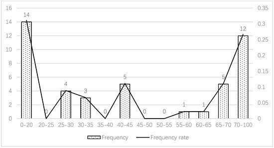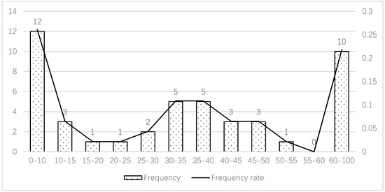The rates of prefabrication and assembly differ among the projects, and their uneven distribution indicates the imbalance of the industrialisation level. PR and AR are taken from the actual project data. Their frequency distribution appears as a W-type curve. In terms of PR, the rates of most projects are below 10% or over 60%, and the rates of several projects are between 10% and 60% (Figure 3). The average PR of the projects is approximately 36.2%. The situation of AR is similar to that of PR, and the rates of most projects are below 20% or over 70% (Figure 4). The average AR of the projects is approximately 45.3%. This phenomenon is extreme in that these companies either do not wish to develop prefabricated housing or wish to develop it at a high level.