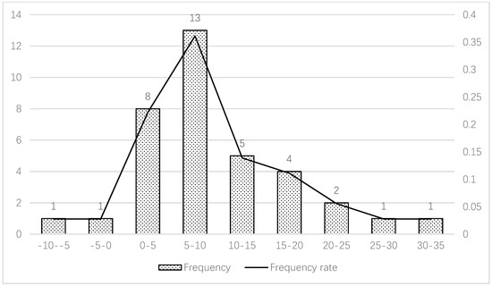 Relative to traditional projects, Figure 9 shows that prefabricated construction can decrease the attrition rate of steel and concrete; the frequency distribution appears as an inverted U curve such that most projects (77.8%) reduce the attrition rate of steel and concrete by 10–30%, which is better in terms of water usage and construction waste. The average attrition is 17.5% lower than that of traditional buildings. The standard deviation is 8.06226, which means that the differences in material attrition in the prefabricated projects are significant and that the effect is below average. Thus, relative to energy consumption, water usage and construction waste, prefabricated housing can offer significant material savings.