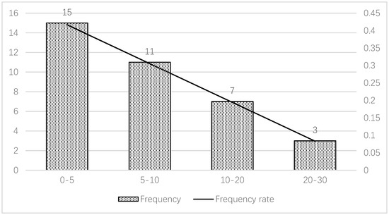 Considering environmental impact, on average, construction energy consumption is reduced by 8.33%, water usage is reduced by 11.67%, construction waste is reduced by 12.22%, and the attrition rate of steel and concrete is reduced by 17.5%. The energy consumption of most projects (approximately 41.7%) is reduced by less than 5% (Figure 6), and the frequency distribution appears as a decreasing curve, which means that prefabricated public housing can save some energy, but there is much room for improvement in terms of benefits. Based on the survey, prefabricated construction does not need a large amount of machinery with high energy consumption on site; tower cranes are most commonly used. However, due to limited technology and management, prefabricated construction cannot save a large amount of energy and may even consume more in another form, such as long-distance transportation.