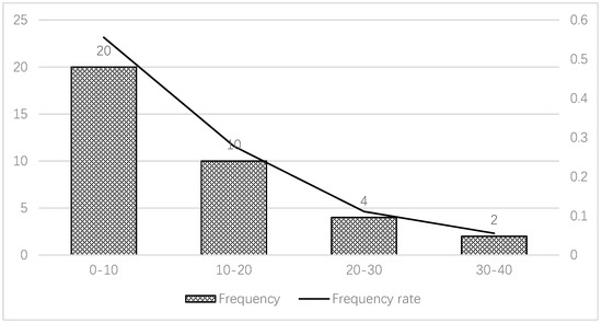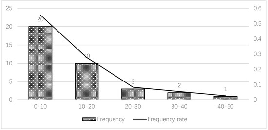 Relative to traditional projects, the water usage and construction waste of more than half of the projects save less than 10%, and both frequency distributions appear as decreasing curves (Figure 7 and Figure 8). Prefabricated construction can save water and reduce construction waste, but only one or two projects saved 30% to 50% of water and construction waste. Clearly, water savings and waste decreases are not extremely efficient; thus, the advantages of prefabricated housing are insignificant because of limited technology and management.