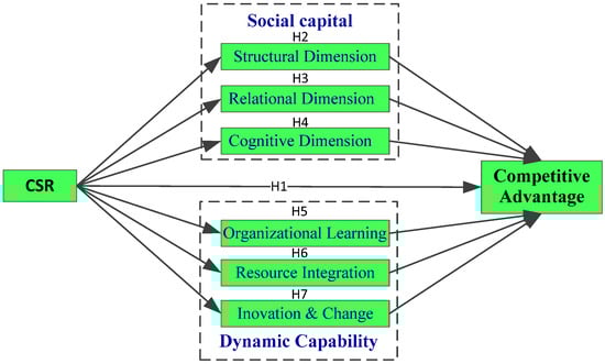 Arguably, resource-based view (RBV) of the firm is established as a compelling conceptualization of the firm’s CA [19,20]. The RBV views organization resource as well as capacity as the main origins of CA. Organization resources can be tangible or intangible. Social capital (SC) as an intangible resource can bring convenience to the actors, which is embedded in the social network of enterprises [21]. Presently, SC has increasingly attracted many scholars’ attention. It has been found that enterprises with more CA can gain CA easier, because networking of internal and external relations has become increasingly prevalent across society [22,23]. Besides organization resources, the capability of enterprises can also significantly affect CA, especially presently, when enterprises are amid highly dynamic and changeable internal and external environments. Scholars claim that in such an environment, dynamic capabilities (DCs) make enterprises able to make appropriate responses and adjustments quickly, and this is very important for enterprises to obtain and maintain CA [24,25]. In contrast to common enterprise capabilities, DCs are the combination of an enterprise’s high-level capabilities. Many scholars have explained the different performances of enterprises under similar environments and organization resource constraints from the perspective of DCs [26,27]. However, both SC and DCs have been ignored in the research to date which examines the correlation between CSR and CA.