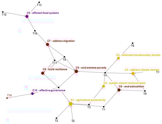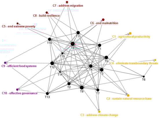 Network graph showing linkages between the trends (Box 1) and challenges (Box 2, challenges of food stability and availability (orange), food access and utilization (red), and systemic challenges (purple) for the food and agricultural systems (based on the FAO report [4]). Arrows represent causal linkages. Note: T1 = Population growth, urbanization, and aging; T2 = Global economic growth, investment, trade and food prices; T3 = Competition for natural resources; T4 = Climate change; T5 = Agricultural productivity and innovation; T6 = Transboundary pests and diseases; T7 = Conflicts, crises and natural disasters; T8 = Poverty, inequality and food insecurity; T9 = Nutrition and health; T10 = Structural change and employment; T11 = Migration and agriculture; T12 = Changing food systems; T13 = Food losses and waste; T14 = Governance for food and nutrition security; T15 = Development finance. Table A1 further explains the information reported in this figure.