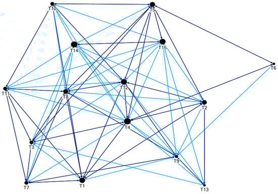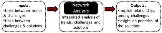 In order to define the relationships between challenges, their links with the root causes, i.e., the trends, were analyzed. These links were identified through bi-modal analysis of the links between the trends and the challenges. The relationship among two given challenges was determined in terms of the total number of common trends that led to both of the challenges. Therefore, the link was unidirectional. The calculated number was used to weight the edge (i.e., the link) between the given two challenges. The obtained matrix of the relationship among challenges was visualized using the software NodeXL, version 1.0.1.381. The conceptual framework of the network analysis has been provided in Figure 2.