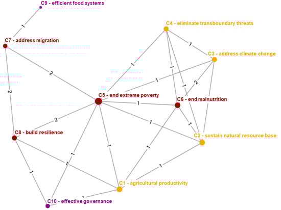 Links among trends were laid out to reveal the explicit and implicit causalities comprehensively. When possible, the impacts of one trend on another were determined in quantitative terms as used in the FAO report to describe the trends (Table A1, Appendix A). These were used to detect how one trend can affect others, either negatively or positively (related trends can become worse, or one trend can contribute to solving another). When available, the links were derived from various sections of the report. When not, information from the literature was used to strengthen the justification of the proposed linkages. The implicit links between trends identified during this analysis were used for network analysis and visualization of the links among challenges. All graphic distributions were performed using the Harel-Koren Fast Multiscale layout algorithm.