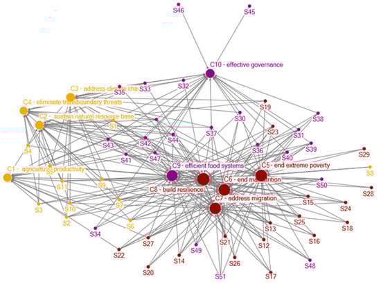 The network perspective considers any system as a set of interrelated actors [27], and has been widely used as a tool in behavioral sciences, and policy network studies. For example, social network analysis has been used for the determination of the interrelations between SDG targets [28]. In another study, researchers applied social network analysis to map out the relationships between smoke-free policies in Europe [29]. Therefore, in this study, the trends and challenges of the future of food and agriculture, as well as their solutions, were considered as a network, and have been analyzed as such as described in this section. The conceptual framework of the network analysis has been provided in Figure 2.