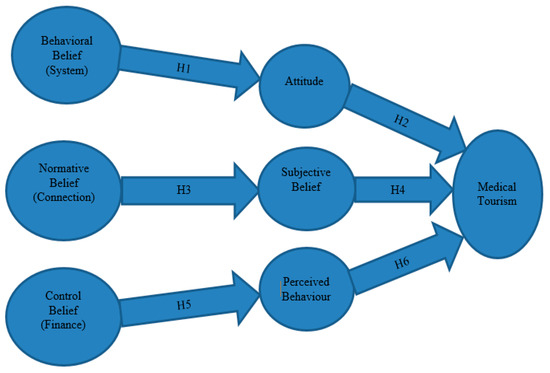 Perceived Behavioral Control (PBC) is associated with someone’s perception of how easy or difficult it is to perform a specific behavior [45]. The perceived behavioral control comprises of the control beliefs (CBs). The control belief (CBs/Finance) is the major factor that measures the perception of the prospective tourists’ resources availability (which is measured with finance) that is required to execute a specific behavior [48,49]. In respect to the current study within the context of health tourism, the perceived control belief means to know how one can gain access to Dubai, and whether one can afford the medical treatment based on external resources constraints. It, however, suggests that even if a prospective tourist has done well with the other mentioned factors but is lacking on finance to pay for the travel to Dubai and all the expenses of the health medication, the intention of such tourist will be lower. In other words, a prospective health tourist with high intention to visit Dubai for health care will be motivated because of the availability of an inexpensive but good medical standard of Dubai’s medical system through the introduction of HHTS.