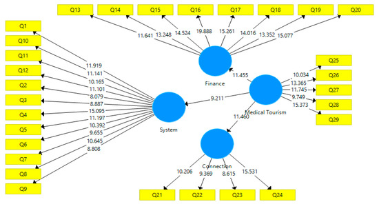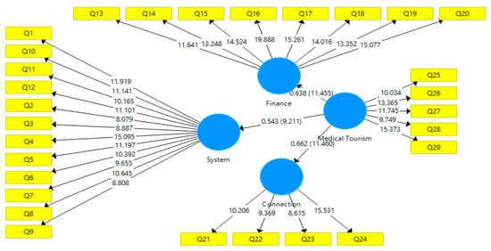 Moreover, the estimates further show that the three factors (FSC) are all positively related with Medical Tourism as indicated in Table 4. Except for the relationship between System and Medical Tourism, which is statistically significant at the 5% significance level, the associations of Finance and Connection with Medical Tourism are significant at the 1% significance level. In addition, the impacts of Finance and Connection on Medical Tourism are very similar (0.2065 and 0.2881 respectively), while the System impact on Medical Tourism is lower (0.0699).