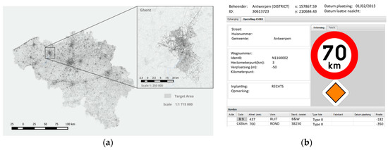 Geographical area and the traffic signs database: (a) Map of Belgium with a detailed view of the city of Ghent and the routing target area; (b) An example of the Flemish road signs database record.