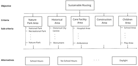 The hierarchy of the sustainable routing problem is defined as follows: the overall goal is sustainable routing, while the level of criteria corresponds to the five sustainable routing elements (Figure 2). The level of sub-criteria corresponds to the different sustainable routing sub-elements, which in our case, are represented by different traffic signs’ meanings (as defined by Table 3).