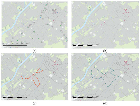 The spatial context of the routing problem in the Merelbeke area, with the indicated types and locations of all traffic signs, is shown in Figure 3a. For clarity, Figure 3b shows the same location, with an indication of only the school area (A23) traffic signs (red points), and vertices of the road network graph that need to be visited by the delivery vehicle (blue points). The vehicle starts at the vertex located on the West part of the network, and needs to make a round tour, visiting two other vertices. In essence, the problem represents the Asymmetric Travelling Salesman Problem (ATSP). The asymmetry is a consequence of the road network directionality, as not all the roads are two-way roads. To solve this routing problem we implemented a well-known Dijskstra routing algorithm with modification: (1) we defined the order of visiting vertices, and then (2) we calculated the path with minimum distance between them. The order of visiting vertices was defined in the initial step, and is equal to the increasing order of Euclidean distances from the starting vertex. When the last vertex is reached, then the shortest returning path is calculated. Figure 3 shows the results for the standard routing problem, (c) and with route sustainability-based results (d).