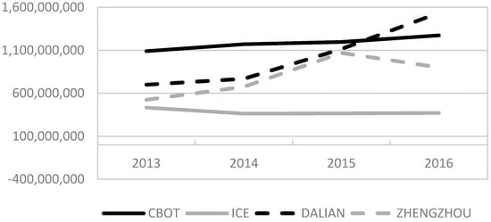Annual volume of futures contracts traded in Chinese and U.S. futures exchanges (2013–2016), ICE here refers to ICE Futures U.S., which is a member of the Intercontinental Exchange. Source: FIA [].