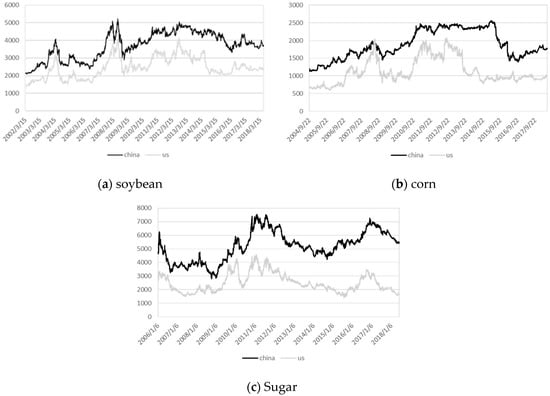 Daily closing prices of soybean, corn, and sugar futures contracts in China and U.S., the unit is yuan/ton. Source: Bric [].