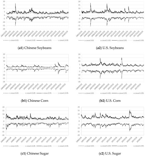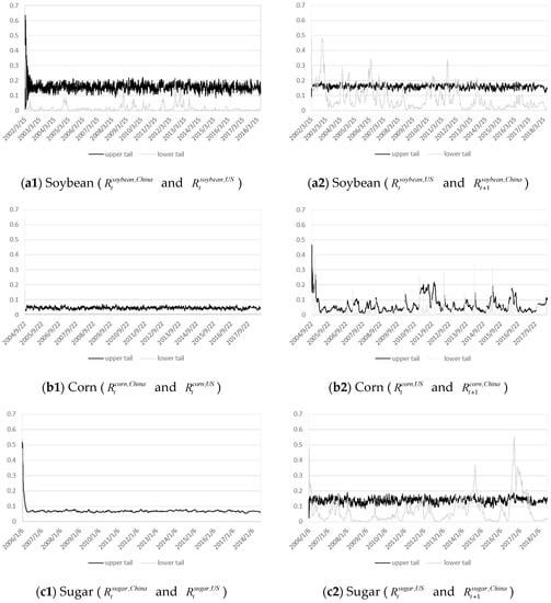 We turn to Copula models to empirically estimate CoVaR measures for our agricultural commodity futures returns series. Following Karimalis and Nomikos [], we use AIC criteria to first identify the best dynamic copula model—from Clayton, Gumbel and BB1 Copula—to estimate CoVaR. Copula models provide a flexible and convenient means of estimating the relationship between several variables’ marginal distributions using a copula function to identify a joint probability distribution. Additionally, Copula models can obtain the tail dependence information, which can also reveal the risk transmission between jointly distributed variables—in our case commodity futures contracts listed on U.S. and Chinese futures markets.