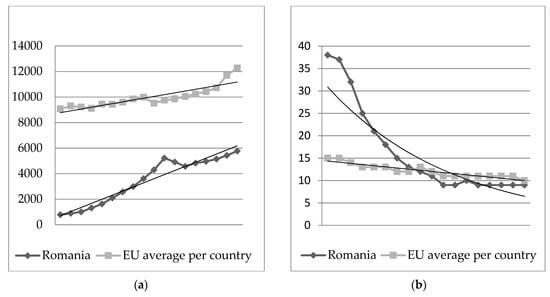 The study relies on the data provided by Eurostat [75] for Romanian and EU accommodation businesses: hotels, camping sites and other forms of provision of short-stay accommodation. Data is collected separately, for a time span of 18 years, between 1999 and 2016, for Romania (dependent variable) and the average per country recorded at EU level by leaving out Romanian data (independent variable). For each year of the aforementioned period, an annual average number of 3447 Romanian companies and an annual average of 9977 EU companies per country were included in the comparative study. The variables to be taken into consideration are quantitative, of a financial and accounting nature, as shown in Table 5. The Romanian level was considered as a dependent, and the EU level as an independent variable for each year during the 18 years when the study was conducted. The variables are closely related to patterns for assessing/measuring business growth, as presented in Table 4 above.