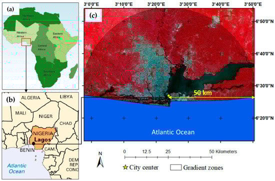Location of Lagos City; (a) map of the African continent []; (b) map of Nigeria with Lagos City []; and (c) Landsat-8 image with gradient zones in a false color composite (band 5,4,3) (18 December 2013) [].