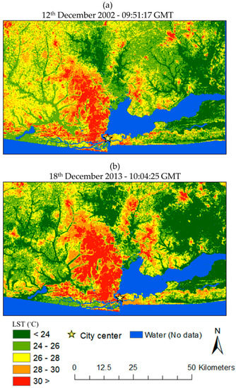 LST map of Lagos City; (a) 2002, and (b) 2013.
