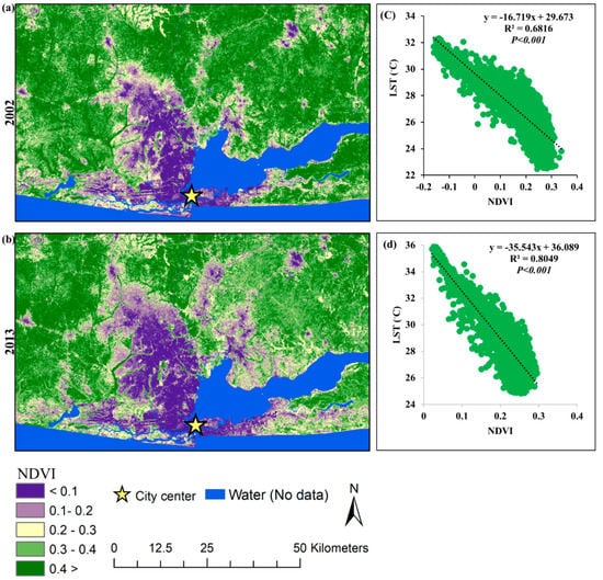 NDVI map of Lagos City; (a) NDVI in 2002, (b) NDVI in 2013, (c) scatter plot diagram between LST and NDVI in 2002, and (d) scatter plot diagram between LST and NDVI in 2013.