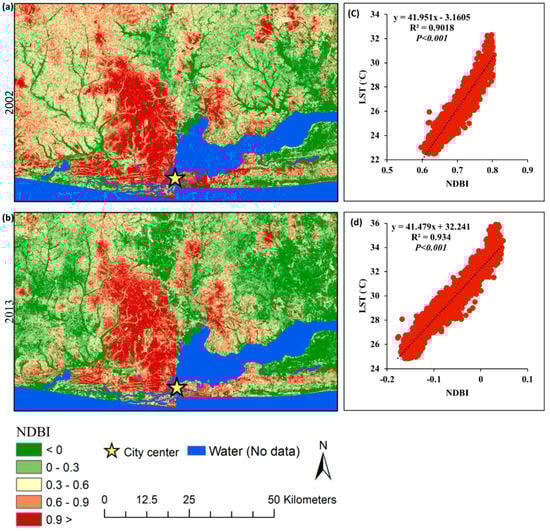 NDBI map of Lagos City; (a) NDBI in 2002, (b) NDBI in 2013, (c) scatter plot diagram between LST and NDBI in 2002, and (d) scatter plot diagram between LST and NDBI in 2013.