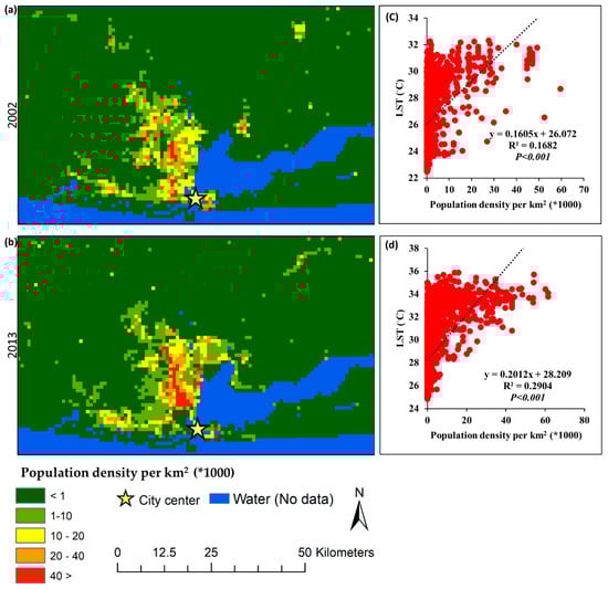 The population density (PD) of Lagos City is shown in Figure 5. Mean population density in 2002 and 2013 was 1572 per km2 and 2063 per km2, respectively. It is observed that the areas where population density increased were mainly accumulated in the city center and suburban area in both periods. The distribution pattern is mainly focusing on the northwest direction as the same pattern shown in NDBI (Figure 4). The pattern indicates that rapid urbanization and economic development influence on the population density []. Moreover, the population distribution along the coastal zone had greater improvement in 2013. Population density is not strongly correlated with LST, but it has considerable improvement in 2013 compared to 2002. The LST and PD have been statistically significant (p < 0.001) in both time points.