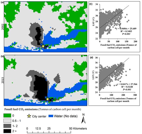 Fossil fuels play a broader role in industrial, transportation, electricity generation, and domestic sectors. As we discussed above, when it increased GDP, there is a higher possibility of using more fossil fuels by the industrial sector. Additionally, the transportation sector of Lagos City had obtained greater improvement after the establishment of the municipal transport service in 1958 []. However, burning of fossil fuels causes the emission of CO2 and abnormal environmental changes, including increasing temperature [,]. A significant positive correlation of LST with FFCOE (Figure 6) illustrated the influence of fossil fuel CO2 on SUHI. The effect of LST is higher in the area where CO2 was highly accumulated in Lagos City between 2002 and 2013 (Figure 6). Moreover, the spatial distribution of the CO2 emission is shown in some similar pattern which is shown by NDBI (Figure 4); both are distributed along the northwest direction from the city center. By this pattern, we realize that urban expansion directly contributes to the emission of CO2 through the anthropogenic activities in Lagos City.