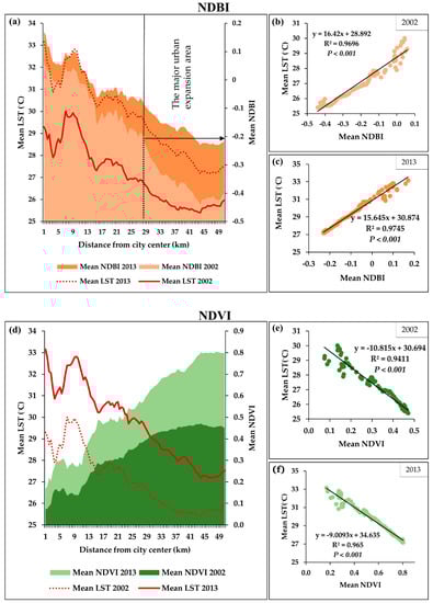 The spatial outline of the LST, NDVI, and NDBI with gradient: (a,d) spatial pattern of the mean LST with NDBI and NDVI in 2002 and 2013, (b,c) scatter plots and statistical relationship among mean LST with average NDBI in 2002 and 2013, and (e,f) scatter plots and statistical relationship among average LST with average NDVI in 2002 and 2013.
