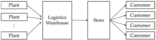 In general, a manufacturer stores new products in one logistics warehouse for each supply chain. Also, a range of products can be shipped from one logistics warehouse to multiple stores, but the specific products and quantities shipped depend on the unique properties of stores, such as clientele, sales floor space, and geographic location or climate. If one attempts to consider all the characteristics of stores in detail, the scope of the data becomes very large. For this reason, we analyze the composition of shipping from one logistics warehouse to one store. Hence, in this paper, the textile and apparel supply chain is considered as shown in the Figure 1. This supply chain includes multiple factories, one logistics warehouse, one store, and many customers. Products arrive in the logistics warehouse from multiple factories, and then the shipping personnel ship products that have arrived in the logistics warehouse to one store.