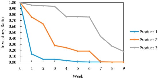 The cluster analysis identifies products that shipping personnel should recognize as undergoing significant changes in inventory. However, the shipping personnel do not know the optimal time or other factors about the shipment. Therefore, the reference lines obtained by cluster analysis (Figure 5) predict the inventory ratio at certain weeks. Changes in inventory that deviate significantly from the basic line are signals that should be transmitted to shipping personnel to highlight important sales information.