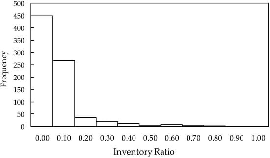 Then, we consider inventory change in our logistics warehouse. Figure 2 shows changes in the percentages of the inventories of products in an actual logistics warehouse. As shown in Figure 2, there are products with inventory ratios of zero in the logistics warehouse at nine weeks, while some products remain in high proportions. Figure 3 shows a histogram of the inventory ratios at the ninth week. The ratio is less than 0.10 for most products, but there are still products with considerable inventory remaining. There are two reasons why large inventories for a product could persist. The first is overproduction, that is, a discrepancy between scheduled and actual sales of product. As a countermeasure, there is the method of discounting and selling inventory or selling it through another channel, such as an electronic commerce (EC) site. The second potential cause is that shipments have been timed poorly. The shipping personnel are the ones who determine the timing and quantities of products to be shipped based on sales information. However, due to the challenge of managing a large number of products, personnel may overlook a signal that a product has sold at its fixed price. If the number of unsold fixed-price products increases, there will be an increase in inventory in need of disposal at the end of the sales period. After considering sustainability, firms should increase the number of products sold at a fixed price as much as possible.