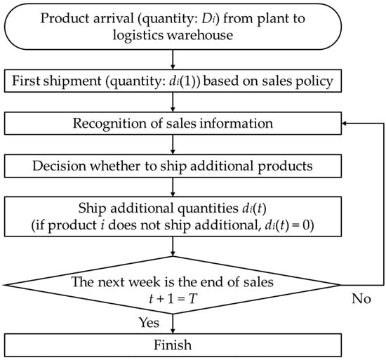 In a textile and apparel supply chain, a company’s factories manufacture products according to a designated production plan. Afterwards, via logistics warehouses, the company ships finished products to stores. At the start of a sales period, a quantity of products is made available at stores based on the production plan. At the end of the sales period, it is hoped that inventories of stores and the logistics warehouse will have harmonized with the production plan as well as with customer demand. In practice, however, customer demand often deviates from what is anticipated in the production plan, and a surplus or shortage results. This is because of the long lead times before a sales period [] and because apparel products are seasonal, that is, usually only one season. Further, in the textile and apparel industry, the logistics warehouses serve as stock points, and therefore, decisions about shipments to logistics warehouses are crucial [].
