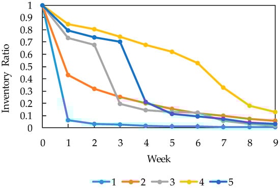 The result of the k-means method suggested that it was reasonable to divide the analyzed data into two groups, which were then roughly divided into five groups to provide more detail. Figure 5 shows the average value of inventory ratios in each week for each of the five clusters. Depending on the shipment percentages in the first week, five clusters can be broadly categorized.