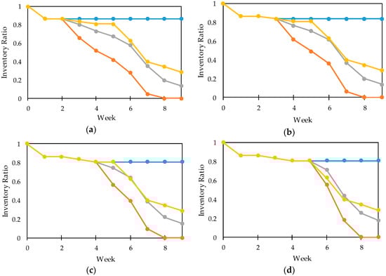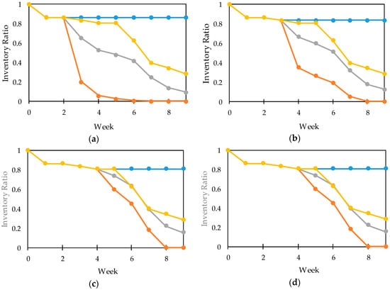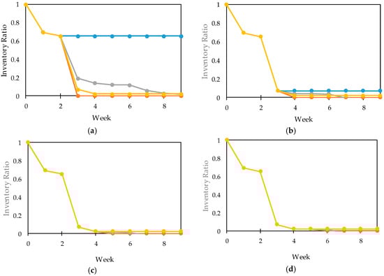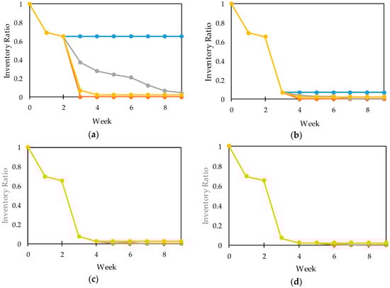 The shipment of the first week is determined by the manufacturer’s sales policy, and shippers who oversee shipping decisions begin shipping after the second week. Therefore, this paper predicts inventory levels for all weeks, conditional on the realized level of sales up to any given week. Form Figure 6a,b, since the shipping ratio at the third week is large, the range of prediction after the fourth week can be narrowed significantly. Furthermore, with the expected value of the conditional probability, which is the gray line, at the time when the inventory ratio up to the second week is known, the inventory ratio of the ninth week has already come close to the actual inventory ratio. Therefore, in the case of product A, the inventory ratio that will result in disposal could be predicted at the second week. Shipping personnel who know this can then reduce the amount of product disposal by considering various countermeasures and taking action.