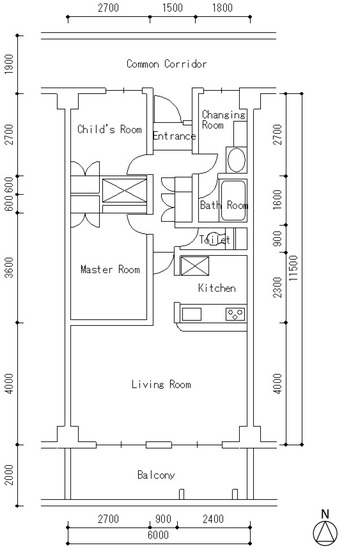 The apartment unit model for this simulation was a common dwelling in a residential complex in Tokyo, Japan. The model was presented in the Journal of Architectural Knowledge (2004) and represents a realistic layout of Japanese apartment housing. We selected a middle-floor unit located at the center of the floor for the simulation. The floor plan is shown in Figure 1, and the details of three insulation types are shown in Figure 2.