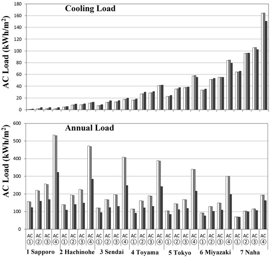 The results for annual AC load show that mostly all of the AC energy use in Sapporo is used for heating. More than 90% of the annual AC load is used for heating in Hachinohe and Sendai. Meanwhile, the annual heating load is below 15% of the annual AC load in Naha. Therefore, the main issue for building energy savings is to identify solutions to reduce the heating load in northern cities and to identify solutions to reduce the cooling load in southern cities.