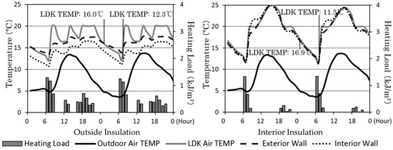 During winter nights, the LDK air temperature kept dropping after the heater was turned off until the next morning. Figure 6 shows that the LDK temperature started dropping after the heater was turned off (11:00 p.m.). In the outside insulation unit, the dropping speed is fast until the LDK air temperature was close to the structure’s surface temperature. The air temperature change in the interior insulation unit, however, was more stable compared with the outside insulation unit. Two hours after the heater was turned off (1:00 a.m.), the LDK air temperature was 16.9 °C, which was 0.9 °C higher than in the outside insulation unit. At 7:00 a.m., before the heater is turned on, the LDK temperature in the interior insulation unit was 0.8 °C lower than that in the outside insulation unit. This lower temperature contributed to a higher heating load (2%) in the first hour after the heater was turned on. In the second hour after the heater was turned on, the heating load for the interior insulation unit was 42% lower than that in the outside insulation unit. The total heating load for these two days in the interior insulated unit was 58% lower than that in the outside insulated unit.