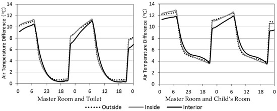 Figure 7 compares air temperature differences between a master room and two other rooms that might be used during the night (the toilet and a child’s room). In the night, from 10:00 p.m. to 7:00 a.m. on the second day when the heater was used only in the master room, the air temperature difference could increase to more than 10 °C between the master room and the other two rooms. The temperature difference in the interior insulation unit was up to 1.5 °C lower than that in the outside and inside insulation units.