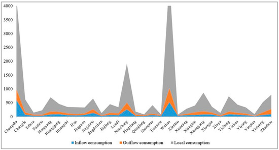 In the context of the new economic normal, with the transformation of China’s economic development mode, the role of consumption in stimulating economic growth has become more prominent, which not only affects the adjustment of urban economic structure, but also promotes inter-city linkages and even the evolution of the spatial organization of the entire urban agglomeration. In 2016, among the cities in the middle reaches of the Yangtze River, total consumption inflows, total outflows, and local consumption of the three provincial capital cities Wuhan, Changsha, and Nanchang were ahead of other cities. The total outflows and inflows of consumption in all cities were much lower than cities’ local consumption (Figure 1).