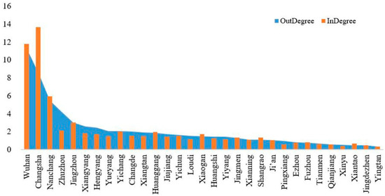 From the perspective of network analysis, the city is the node of the consumption network, and the centrality of characterizing the importance of the node is the primary indicator of network analysis. Since interurban consumption flows are divided into two directions of inflows and outflows and have different values, the urban consumption connection forms a directed relationship network. Therefore, the centrality of the urban consumption network can be divided into InDegree and OutDegree. For each city, the city’s InDegree and OutDegree are sorted in order of high to low. The results are shown in Figure 2. From the OutDegree, the top five cities are Wuhan, Changsha, Nanchang, Zhuzhou, and Jingzhou, which shows that these five cities have more outflow consumption connections than other cities in the middle reaches of the Yangtze River. In addition, Wuhan has the most outflow consumption connections and the greatest impact. From the InDegree, the top five cities are Changsha, Wuhan, Nanchang, Jingzhou, and Zhuzhou, indicating that these five cities have more inflow consumption connections than other cities, and Changsha has the most inflow consumption connections and the greatest impact. Among these cities, Wuhan, Changsha, Nanchang, Zhuzhou, and Jingzhou are at the top of lists of OutDegree and InDegree, while Yingtan, Jingdezhen, and Xinyu have low rankings in the urban agglomeration. It can be seen that Wuhan, Changsha, Nanchang, Zhuzhou, and Jingzhou have higher mobility in consumption than other cities in the urban agglomeration. Overall, the consumption network of the urban agglomeration in the middle reaches of the Yangtze River has an outward central potential of 9.484% and an inward central potential of 11.891%, indicating that for the entire urban network, the inflow of consumption has greater central potential than the outflow of consumption.