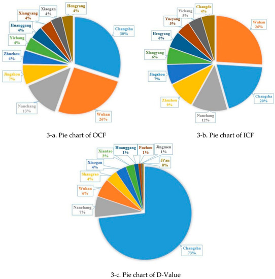 First, from the perspective of OCF, the OCF in Changsha, Wuhan, and Nanchang ranked in the top three in the middle reaches of the Yangtze River, and Jingzhou and Zhuzhou ranked fourth and fifth, respectively. Among the top ten cities in the urban agglomeration, six cities are from Hubei Province, three are from Hunan Province, and Nanchang is the only city in Jiangxi Province. This shows that the cities in Hubei Province have the most advantages in spending of consumption outflows, followed by Hunan and Jiangxi Province.